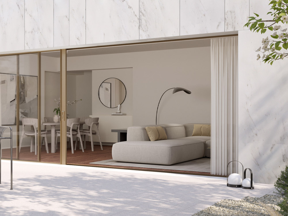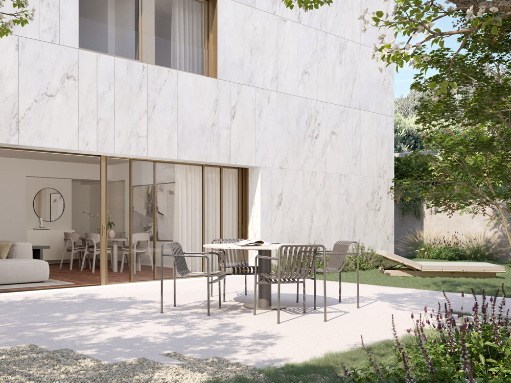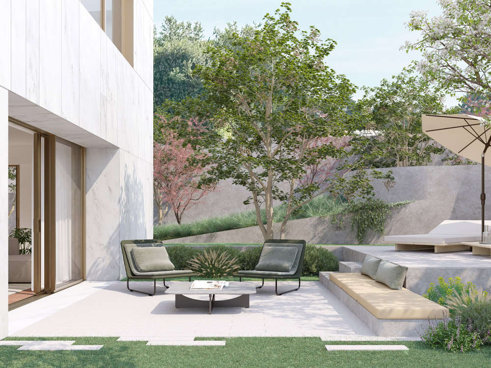 Nesta exclusiva VILLA duplex (tipologia T4) o piso térreo estabelece uma conexão fluida com o exterior, estendendo as áreas sociais da casa para amplos jardins privativos.