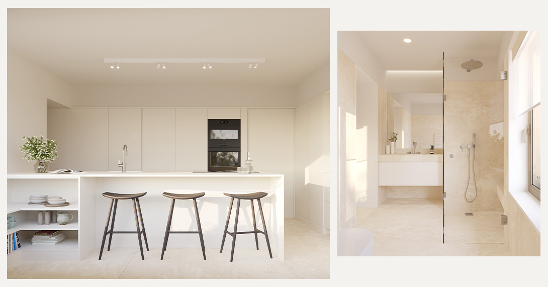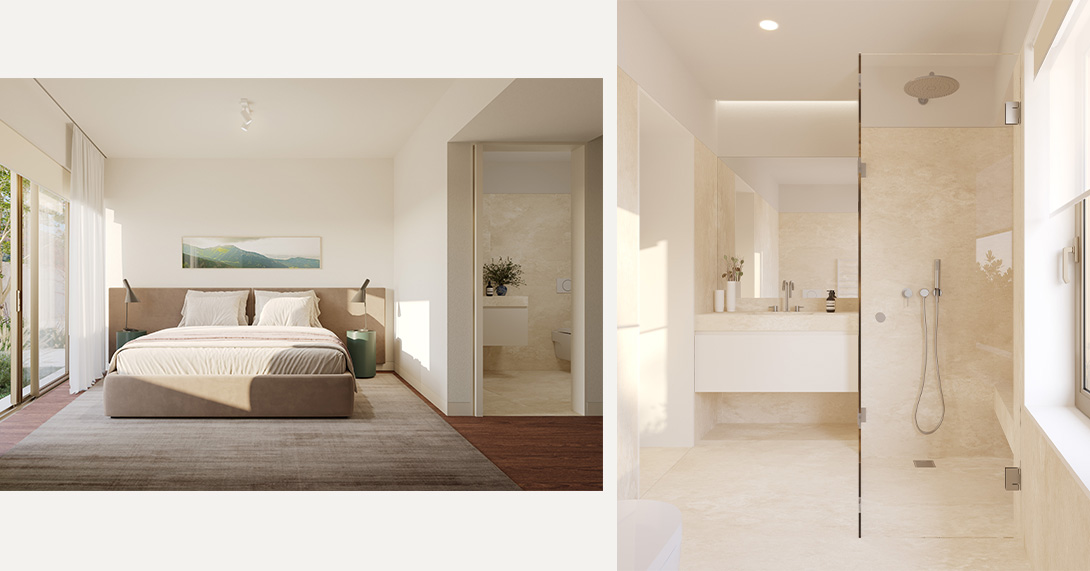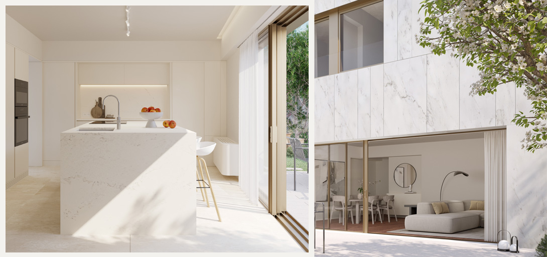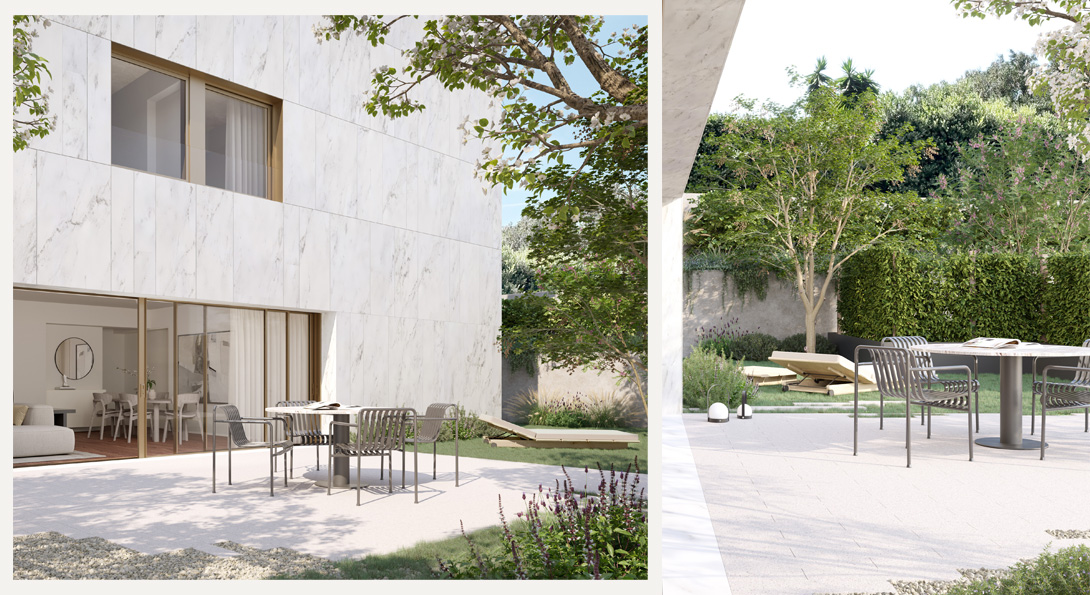 Nas quatro VILLAS duplex (T3, T4 e T5) desenvolvese, ao nível do r/chão, uma relação direta com o exterior que prolonga o interior da habitação para os espaços privativos de generosos jardins, numa feliz e privilegiada ligação com a Natureza.